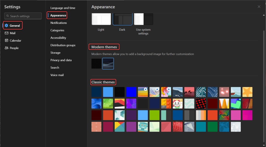 To get to where you can set the image, go to the Outlook settings and select General > Appearance. You can select the modern theme (my choice), or you can choose from one of the classic themes. Just click on the image you want to use, and you’re done: