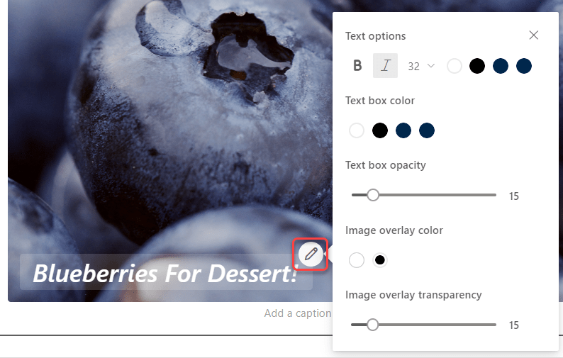 Once you add an image to a SharePoint Online page, you will see the editing toolbar at the top of the section. Select the Text overlay option to get the text box on the top of the image: