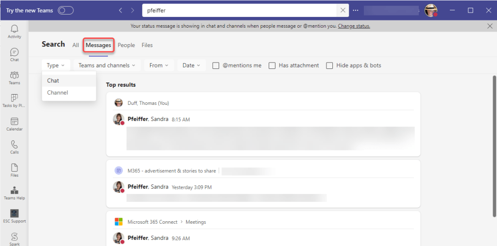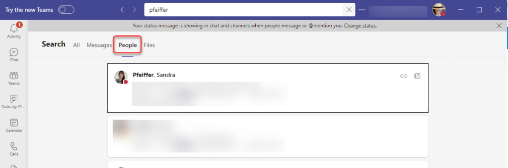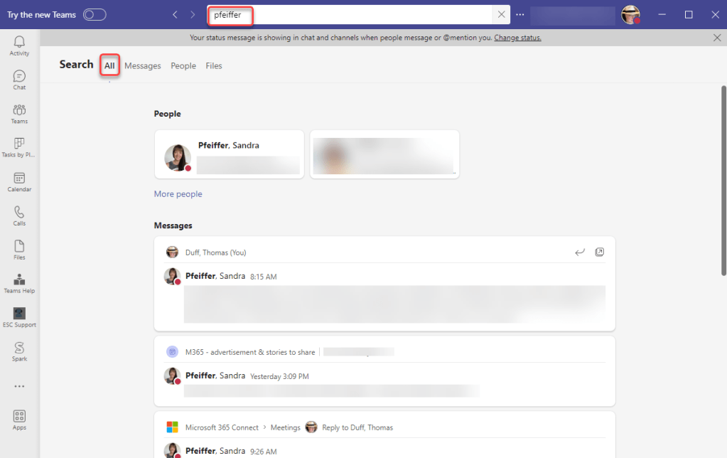 In this example, I’m searching for “pfeiffer” in Teams. If I do no narrowing down of the results, I’ll get the All list of results, showing People, Messages, and Files: