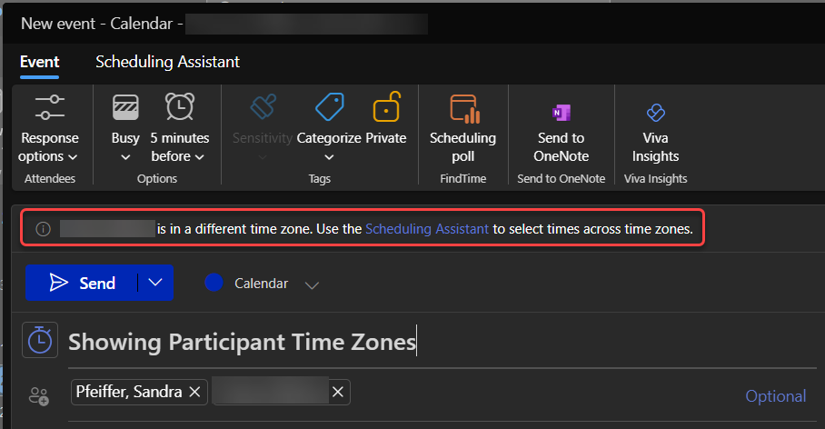 In this example, I started to book a meeting for three people. However, when I selected the names of the attendees, I was presented with a tooltip that told me that one of the individuals was in a different time zone than my own, and I could use the Scheduling Assistant to get more information: