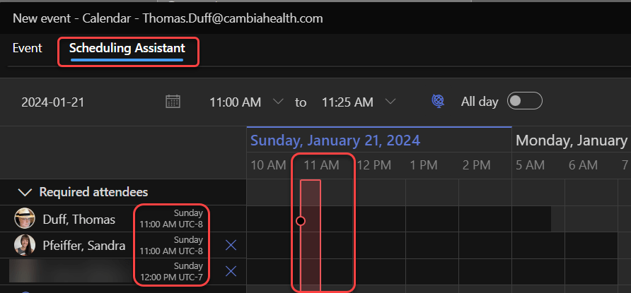 In the Scheduling Assistant layout, I could see what person and what time zone was represented, and I have the option to book the meeting at a different time that may not be potentially inconvenient to one or more of the attendees: