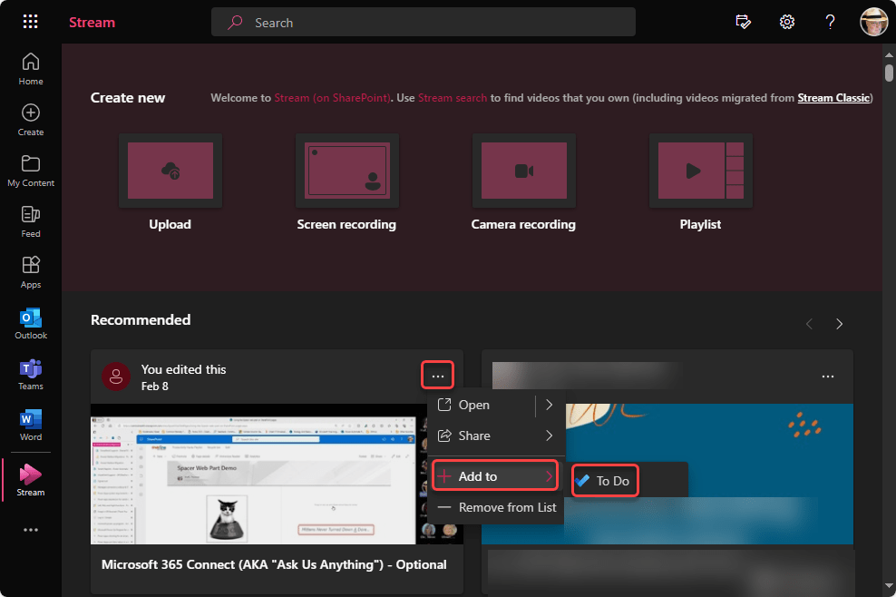 In Stream, I have a video I’d like to remember to watch at some point. I can click the ellipsis and select the Add to > To Do option:
