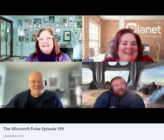 Episode 199 of the Microsoft 365 Pulse Roadmap webcast is now out on YouTube. Join Adam Ochs, Jennifer Mason, Tamara Bredemus, and myself as we cover this week’s updates.
