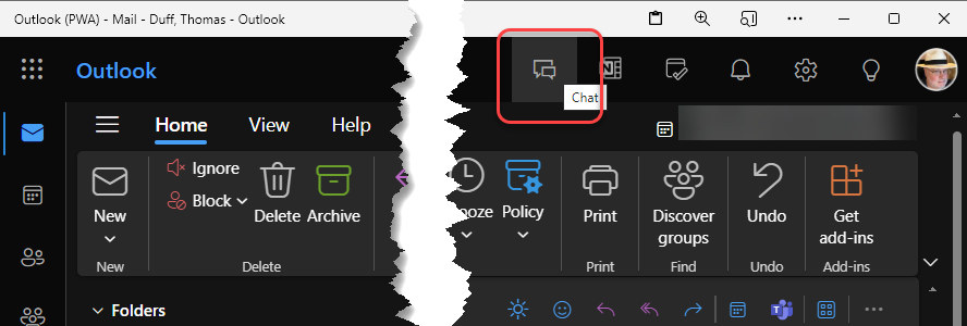 From within Outlook on the web, you’ll see a Chat icon in the upper-right corner. Click it to start the chat process: