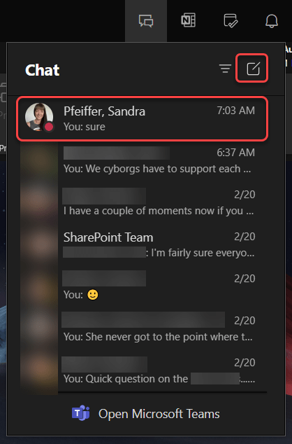 The Chat panel will show your seven most recent chats. You can either start a new chat (the New Chat icon in the upper-right corner), click on an existing chat, or open Microsoft Teams to access additional chats: