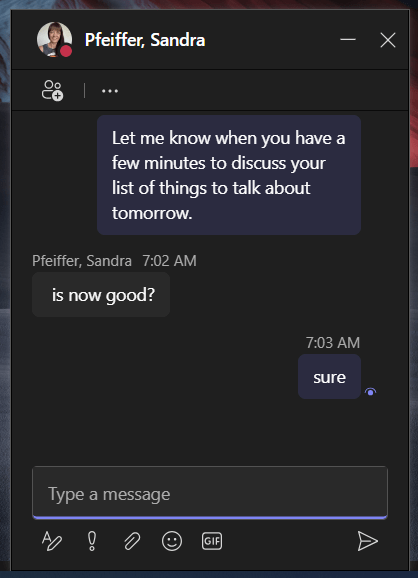 This example is clicking on one of the seven listed chats. I can now continue to chat with that person just as if I were in Teams: