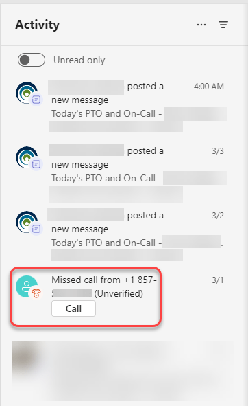 In this example, I have a missed call (that I ignored because there was no caller ID on it), and I really don’t care to see it in my Activity Feed as it’s taking up space with no real value to me: