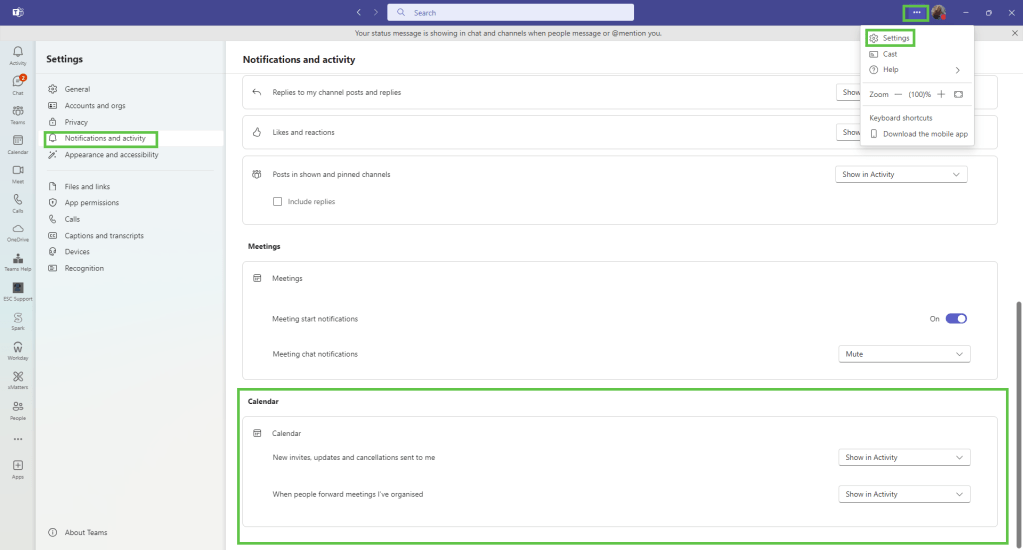 To shut off those notifications, go to the Settings option in the upper-right corner of Teams, and select Notifications and activity. Scroll down to the Calendar settings: