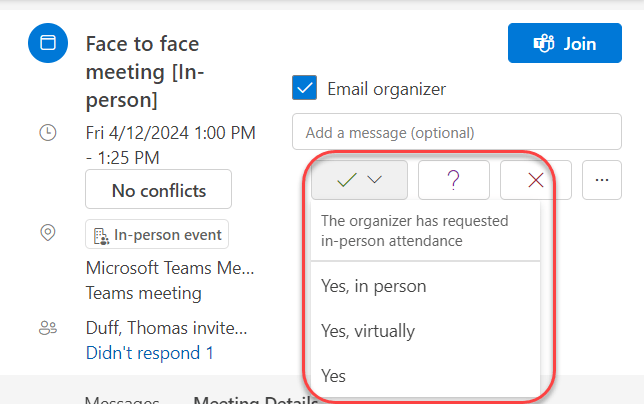 The option for accepting the meeting now allows you to designate whether you will be attending in-person or virtually: