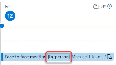 The entry in your calendar will have the [In-person] tag in the title so that you know it’s a meeting that will be expecting a physical presence: