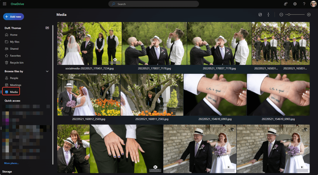 In this example, I know I had some of my wedding photos in my OneDrive, but I really had no easy way to search for them by name. But by using Browse files by > Media, I can see all my media files in my OneDrive, and it’s easy to scroll through and find them!