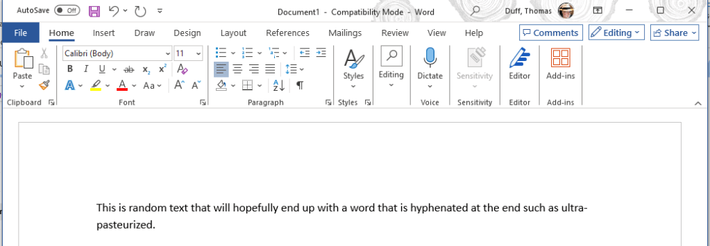 In this example, I’m using the compound word “ultra-pasteurized”. The word showed up at the end of the line, and Word treated it like a hyphenated single word: