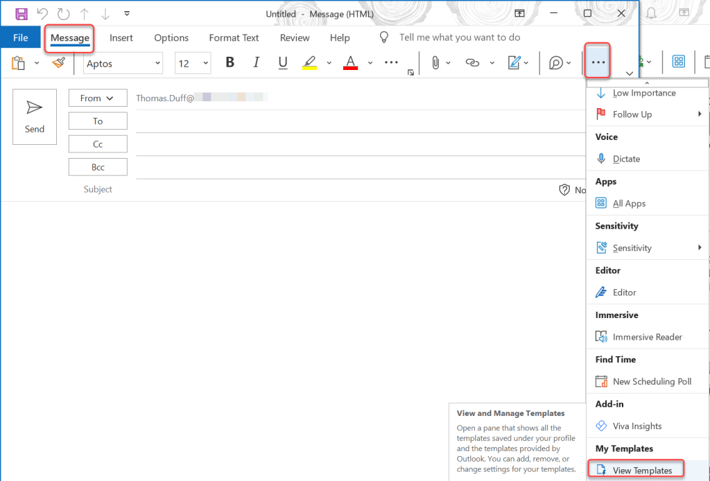 To get to the Templates feature, open up a new email and go to Messages > My Templates > View Templates: