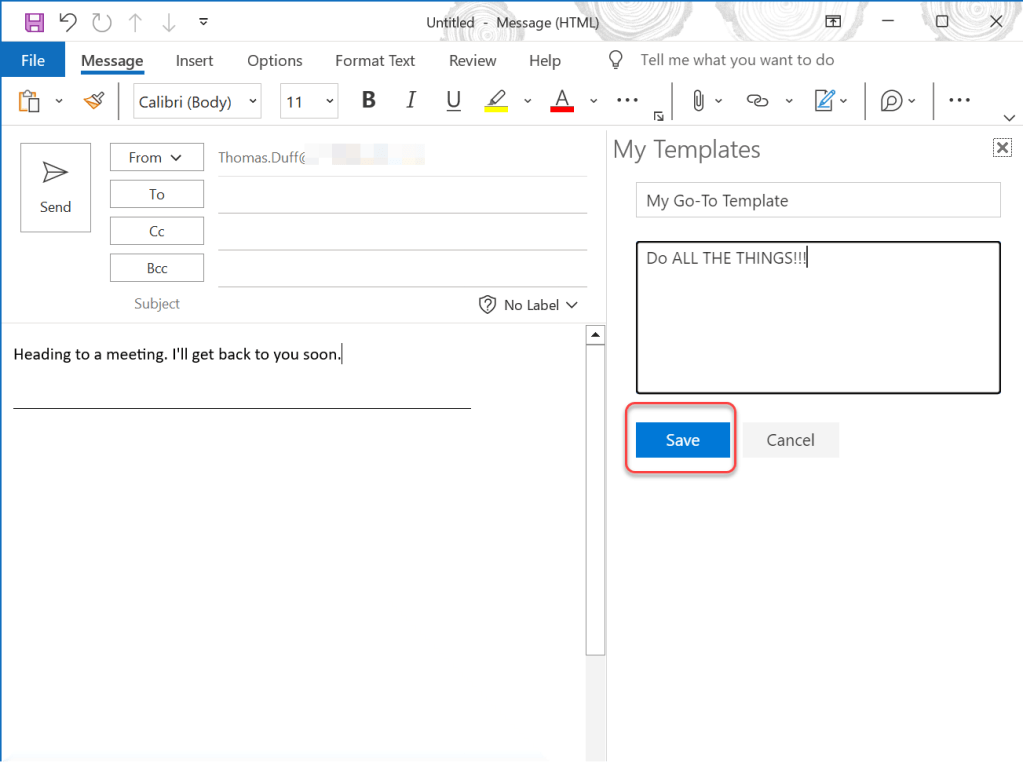 I built a template titled My Go-To-Template with Do ALL THE THINGS!!! as the body of the email. I clicked Save so I can use it in the future: