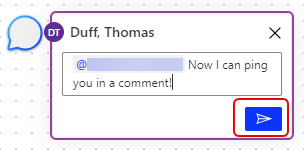 When you’re in the Whiteboard and create a comment, you can now use the @ symbol followed by the name of the person you want to notify. Once you have their name and message in place, click the Send icon: