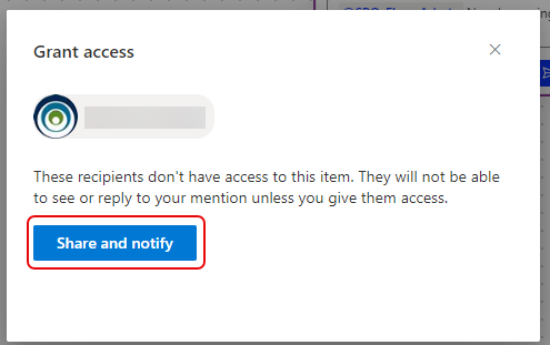 If the person does not have access to the Whiteboard, this message will appear and allow you to grant them access so they can see and work with the content. Click on Share and notify to grant them access: