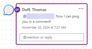 Whiteboard has allowed comments for some time, but they didn’t allow you to @ mention someone in the comment. This was already a feature in applications like Word, Excel, and PowerPoint. Now Whiteboard will work the same way. Here’s how that looks and works…