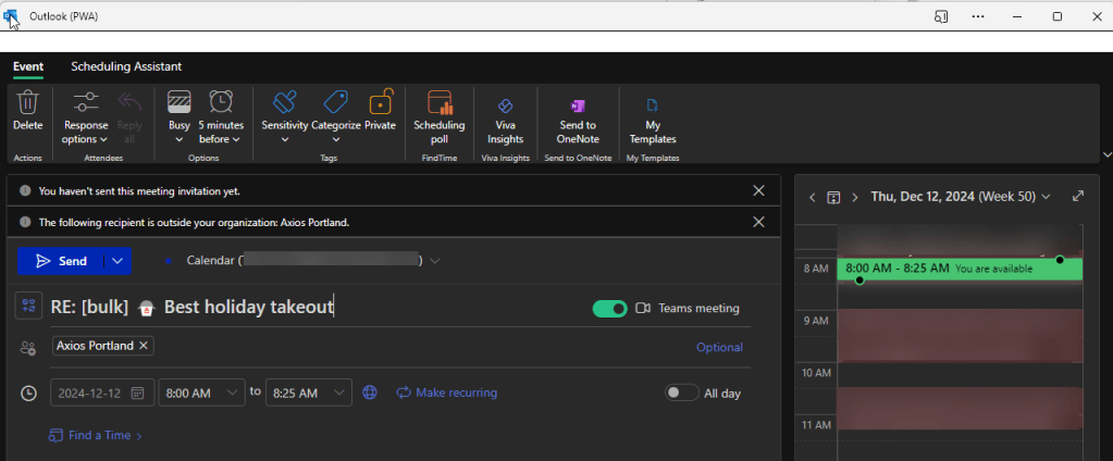Outlook thinks about it for a few seconds, and then opens up a new calendar entry, putting in the entire email body into the body of the calendar invite. All you have to do now is add attendees, pick a date and time, and send it: