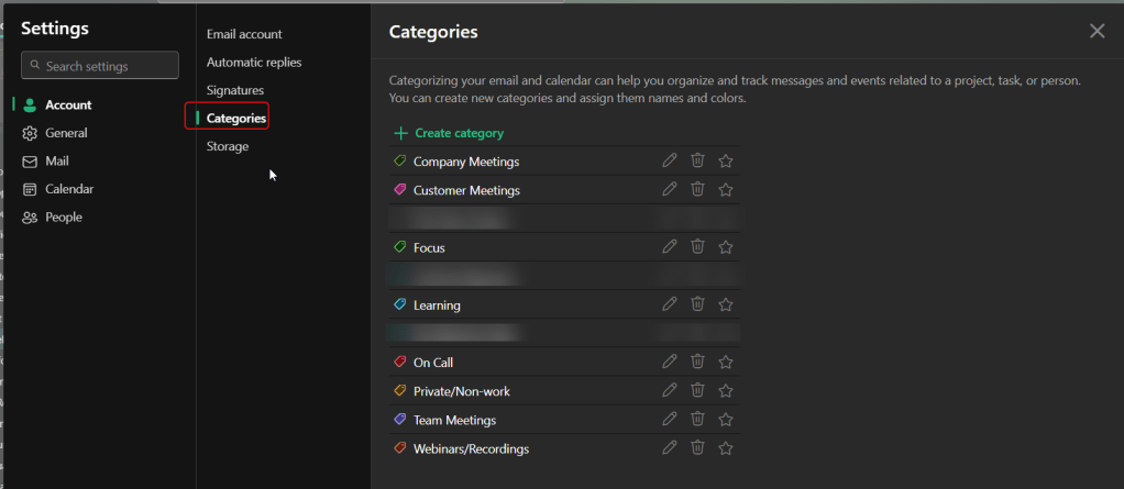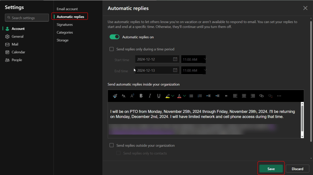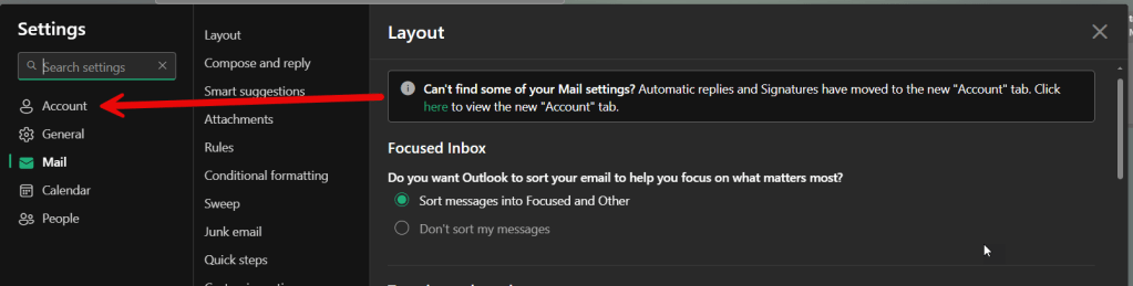 When going to update some account settings in Outlook on the web, I noticed that certain things were missing in terms of where I normally would find them… such as the Automatic replies and Signatures. Turns out they’ve been moved from the Mail tab to the new Account tab. Here’s what that looks like now…