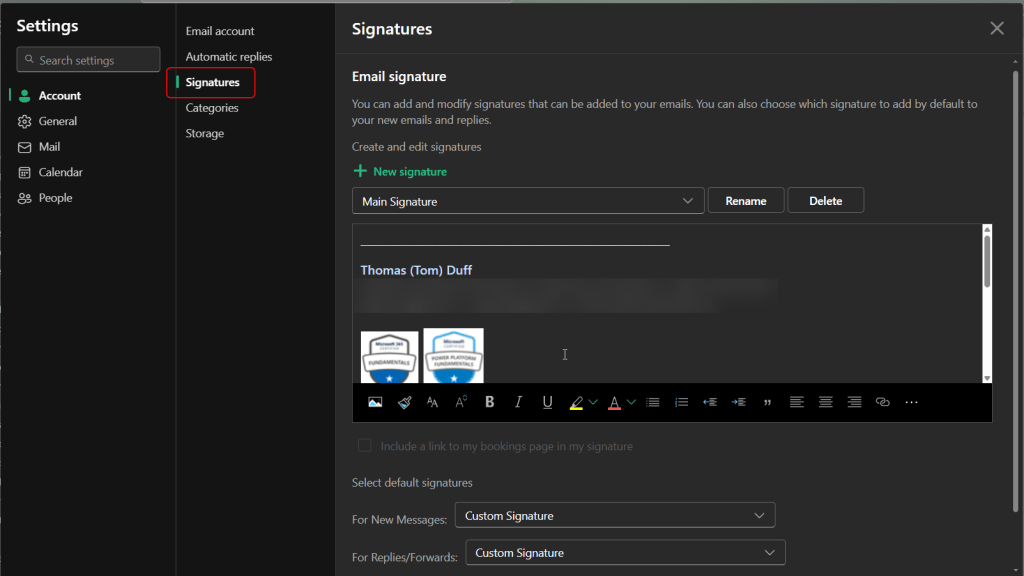 Signatures have also moved to the Account tab. Much like Automatic replies, it looks much the same: