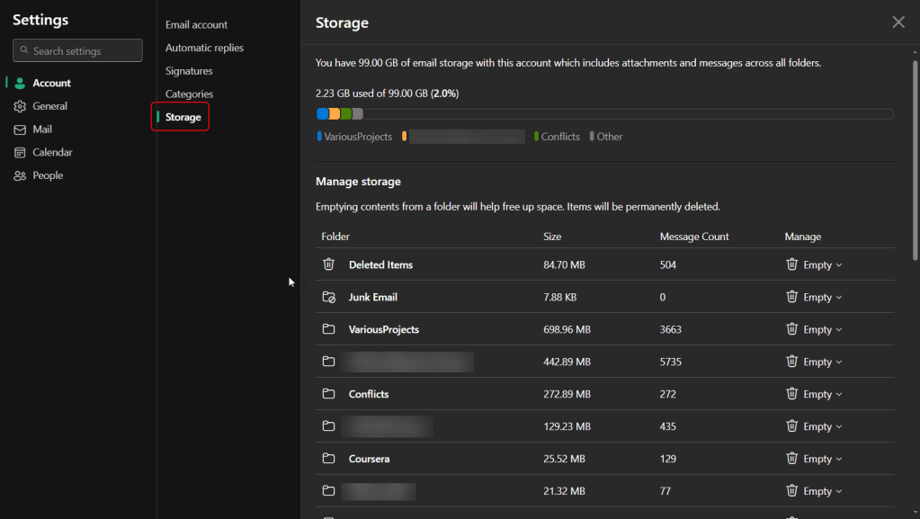 Finally, you have the Storage area that shows you your folders, the amount of storage they take up, the number of emails stored in the folder, and a way to quickly manage the clean-up of that folder: