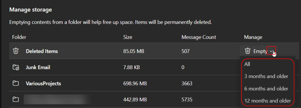 By clicking on the dropdown arrow next to Empty, you can either delete all the contents of the folder, or delete based on a 3 month, 6 month, or 12 month cut-off: