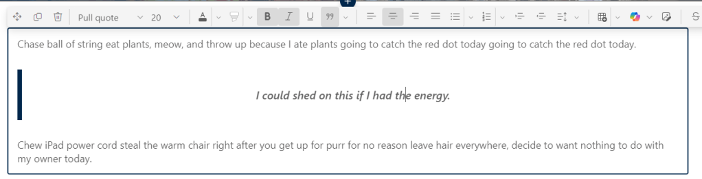 In the SharePoint page Text web part, you’ll see a pull quote icon in the text ribbon bar. In my example, I wanted to take the second sentence and have it show up as a pull quote. I highlight that second sentence and click the dropdown arrow next to the pull quote icon. That gives me the list of what type of pull quote to use:
