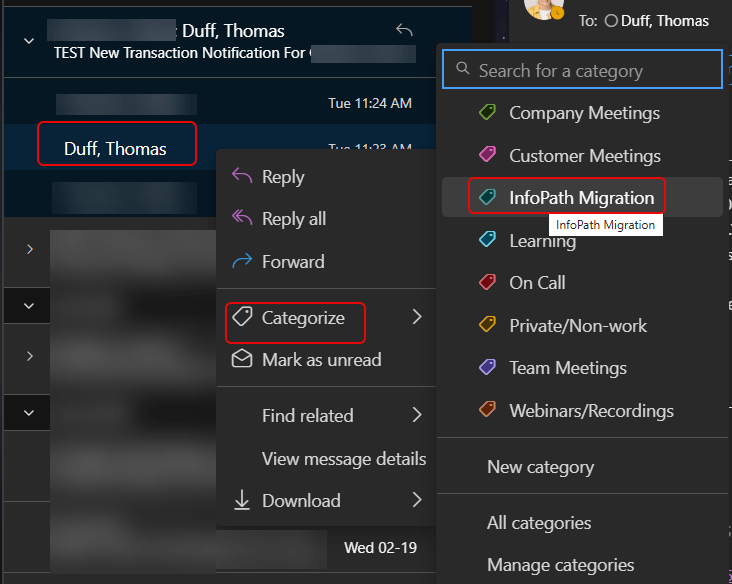 To do so, I right-click that email, click Categorize, and select the category that applies to that specific email: