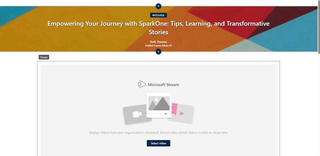 After a pretty short period of time, you have a page with starting points for banner images, page title, and perhaps a Stream web part for a video: