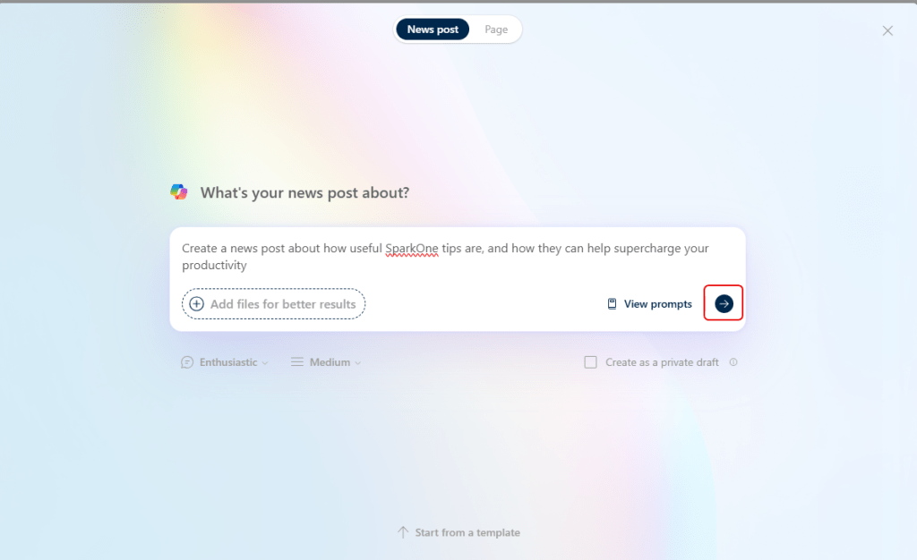 Here’s what the prompt page for a News Post looks like. Describe what you’re looking for, and click the submit arrow to get going: