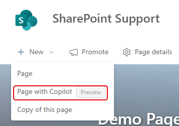 When you’re on a SharePoint page, click the dropdown for the New option and select Page with Copilot: