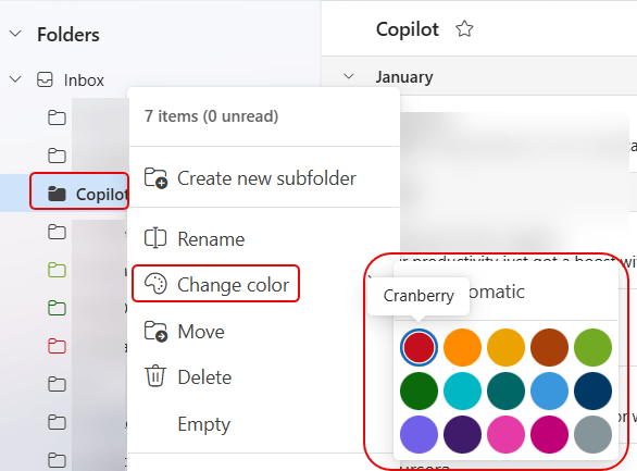 Since I selected Cranberry, my Copilot folder now shows in that color when I’m in that folder: