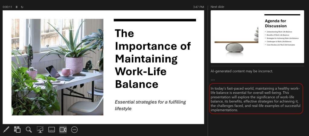 Now, the caveats… This isn’t meant to be something that you can save and use without any review or work. It’s meant to be a starting point for your presentation, so that you can add, remove, and modify the content to fit your particular situation. Also, as with all generated AI content, you need to check it for errors or incorrect material.