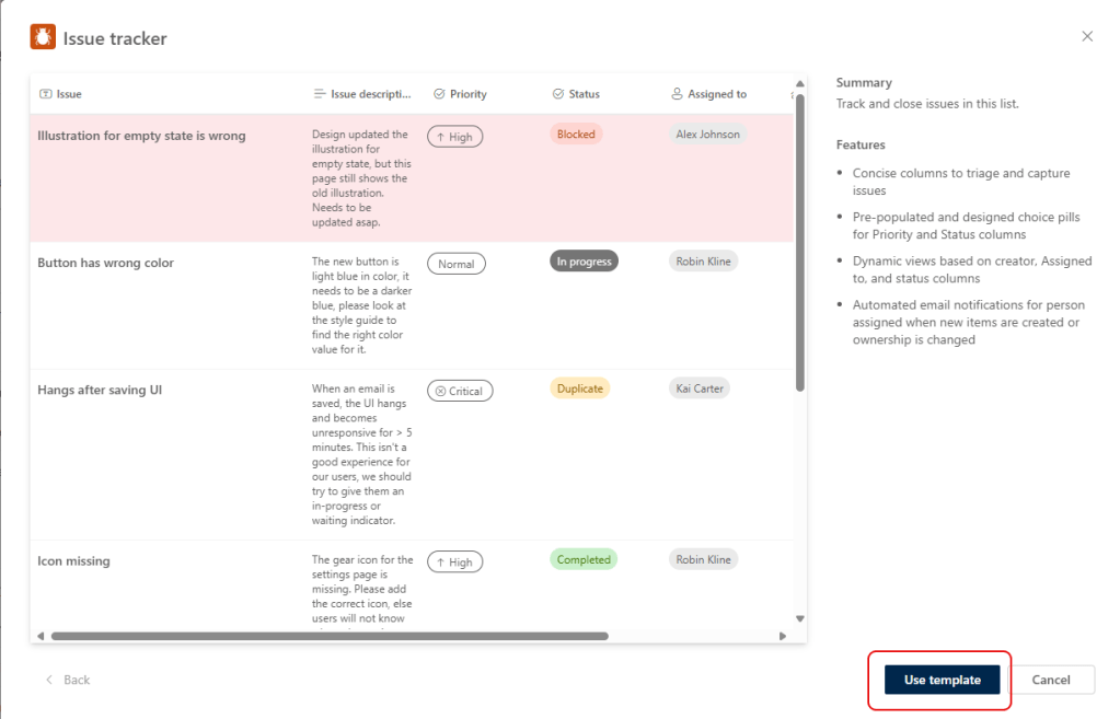 In the second example, I selected the Microsoft-provided Issue Tracker template: