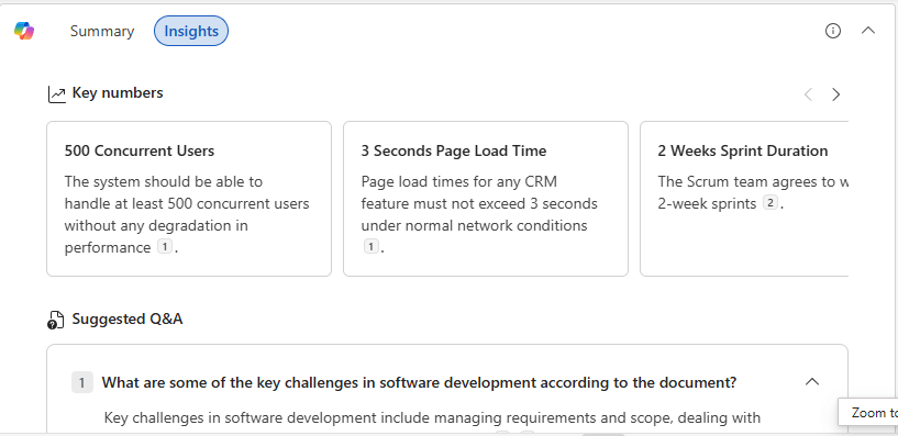 I opened up the Challenges in Software Development Word document in my OneDrive, and Copilot goes to work automatically on generating the summary: