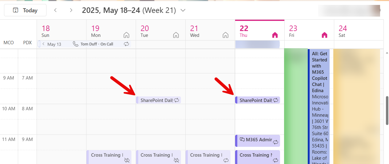 So… this isn’t an earth-shattering change, but It’s sort of interesting. Sandra noticed yesterday that when viewing the Outlook calendar on Outlook on the web, meetings that were before the current date and time now appear in a lighter color gradient than current/future meetings. Here’s what that looks like…