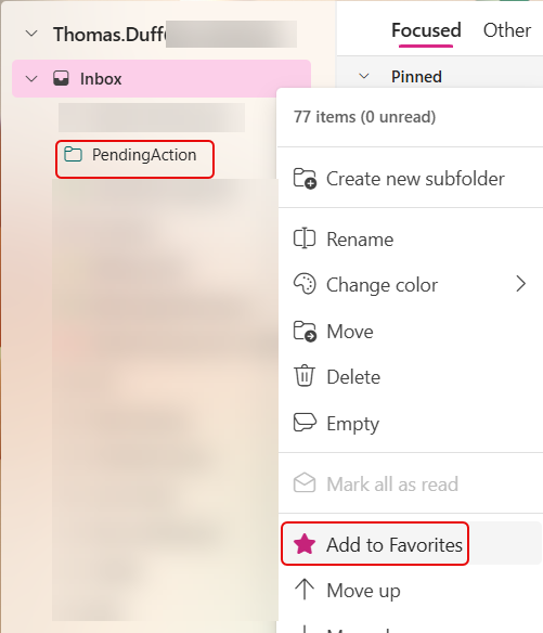 I’m in Outlook on the web in this example, but it works on all the Outlook clients. Find the folder you want to flag as a favorite. Right-click on the folder and click on Add to Favorites: