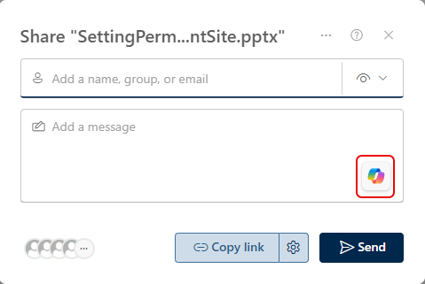 While you’ve always had the option to add a message to the sharing email, it’s often left blank. If you have a Copilot license, you’ll now see the Copilot icon in the Add a message area: