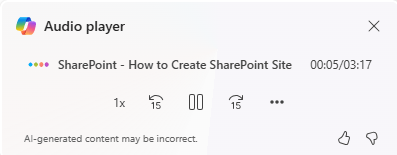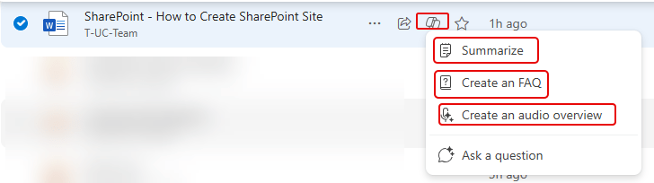 In this example, I’m looking at a document on how to create a SharePoint site. I’m interested in the contents, but I don’t want to open it up and read the whole thing. Instead, I click on the Copilot icon that shows up when I select that file. From there I can summarize the document, create an FAQ, or get an audio overview: