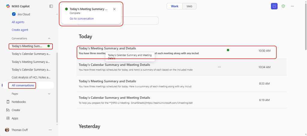 When the scheduled time arrives, the prompt will run. You can see the output by clicking Conversations in the left-side navigation and selecting the specific prompt, or click on All conversations to see a list of all prompts that have been run. The green icon shows that it’s a scheduled prompt that you haven’t viewed yet: