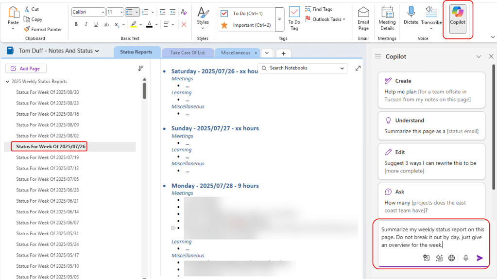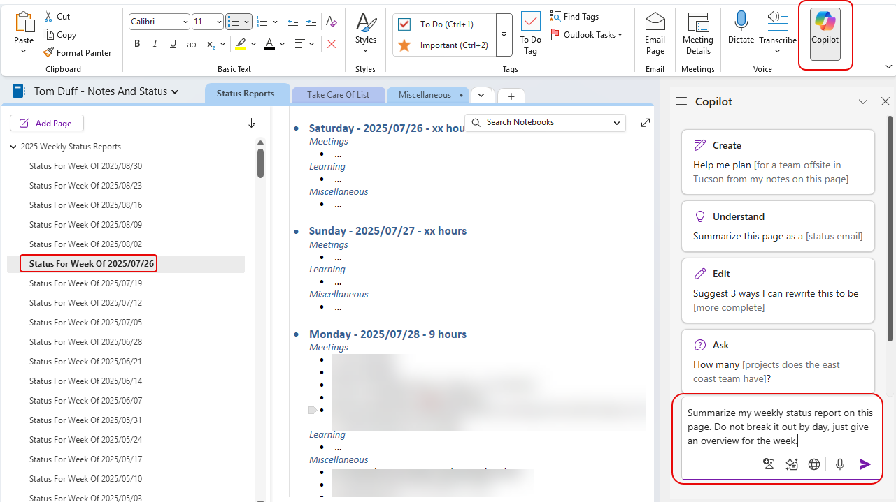 In this example, I’m in my section where I store my weekly status reports. I click on the Copilot in the upper-right corner of the ribbon bar, and the Copilot panel appears. It gives me some sample prompts that focus on creating content, understanding content, editing content, and asking questions about the content. Here, I want it to summarize the weekly status report. My prompt is “Summarize my weekly status report on this page. Do not break it out by day, just give an overview for the week.”: