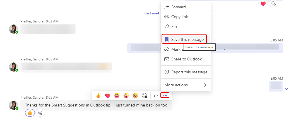 Here’s a message from Sandra that I want to come back to at some point. I click the ellipsis for the message and select Save this message: