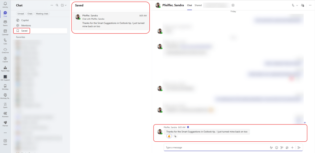 Now… I go to the Activity area in Teams and I see a new area labeled Saved. Everything that I have saved will appear, and if I click on an entry, it’ll take me to the actual chat or conversation that has the saved message: