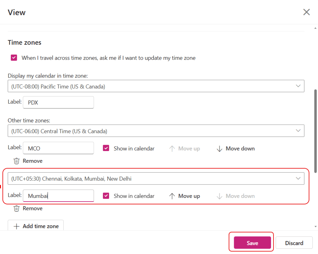To set that (in Outlook on the browser or New Outlook), I go into Settings > Calendar > Time Zones. I can then start looking up new cities and adding their time zones to my calendar. In this case, I selected Mumbai: