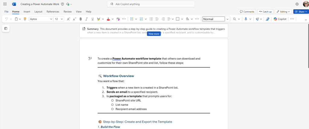 In this example, I had prompt output related to building a Power Automate workflow. When I go to the bottom of the output, I can click on the ellipsis and select Open in Word: