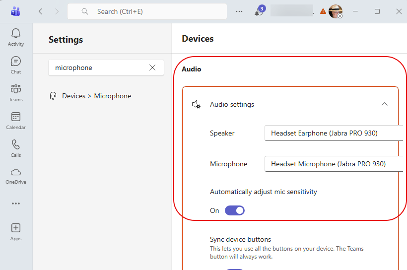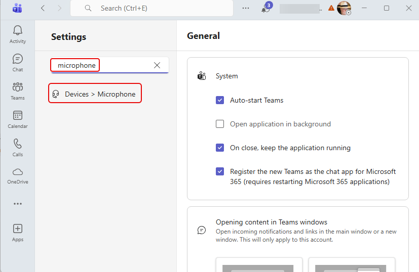 I’m in Settings for Microsoft Teams, and I want to change my microphone options. Under Settings, I can use the search bar to go directly to that part of the settings: