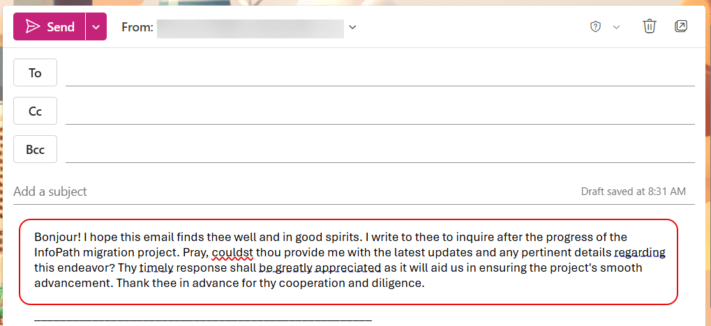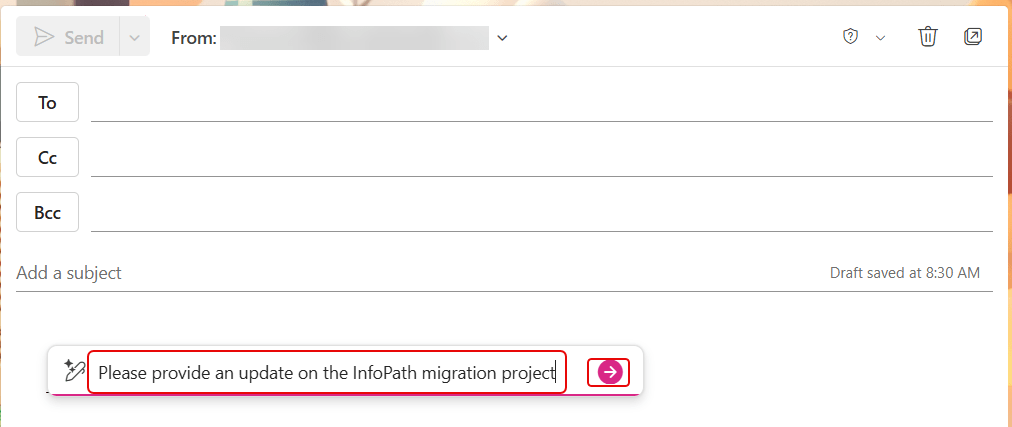 In a new email, I asked Copilot to ask for an update on our InfoPath migration project:
