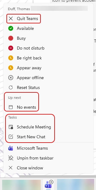 If you’re a Windows user, you are probably aware that you can right-click on an application icon in the Windows Task bar to see shortcuts to various options for that particular application. The Microsoft Teams desktop application has had some changes to the jump list that might save you some time. Here’s what it now looks like…