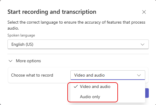 When you start the recording, you get the Start recording and transcription panel. But there is now a new option to Choose what to record. It can be either Video and audio (the default) or Audio only: