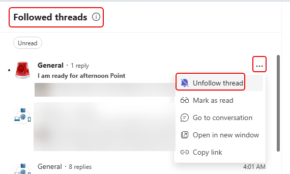 By doing that, I’ll see that thread show up in the Followed threads area. If I no longer need to follow what’s going on there, I can click the ellipsis and select Unfollow thread. That will remove that thread from my Followed threads: